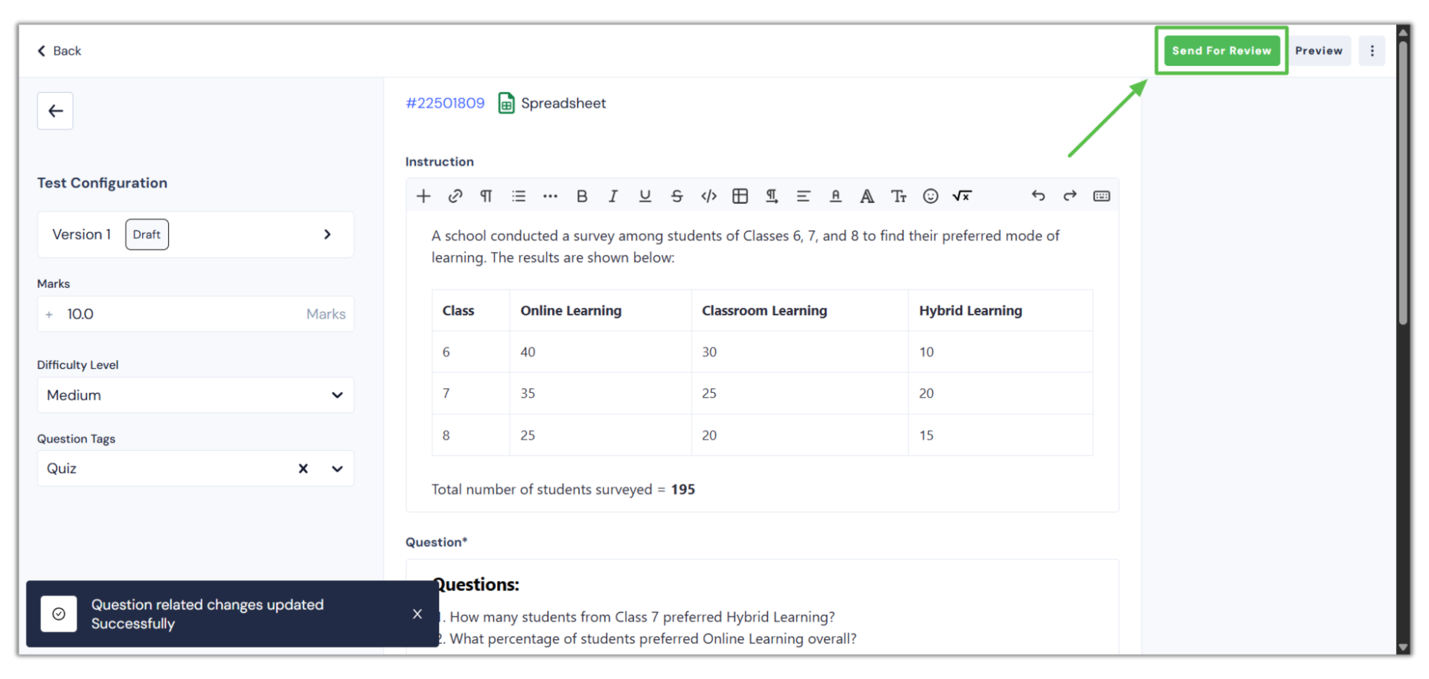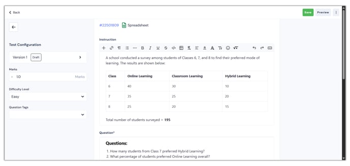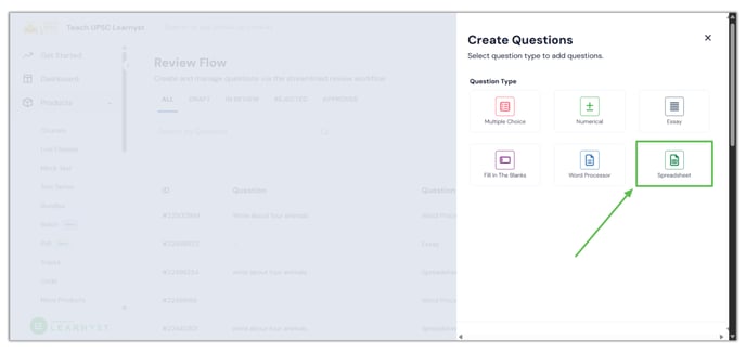 - To Create a Spreadsheet processor question type, go to the question review flow.