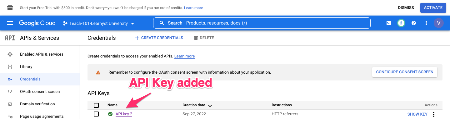 You can now see the API key added as shown. Next, let us configure this project by creating the OAuth Consent Screen